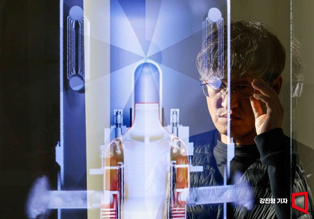 차세대 에너지원으로 소형 모듈 원자로(SMR)가 주목 받고 있다. 소형 모듈 원자로는 1000MW 이상의 출력을 내는 대형 원자로와 달리 300MW 미만의 작은 출력으로 주요 기기의 일체화를 통해 모듈 형태로 생산 가능한 원자로다. 기존 대형 원전보다 안전성이 높고 설치공간을 적게 차지하며 원전 설계 및 운전 절차가 단순해 고장 발생 가능성이 낮다. 최근 AI 기술의 폭발적인 확산과 전기차 보급 확대로 전 세계의 전기 수요가 급증하고 있는 시대에 한국형 소형 모듈 원자로 기술 개발로 세계 시장의 주도권을 선점하길 희망한다. 사진은 대전 유성구 혁신형소형모듈원자로기술개발사업단에서 권용세 책임연구원이 혁신형소형모듈원자로의 열교환 과정을 홀로그램 시뮬레이션을 통해 점검하는 모습.