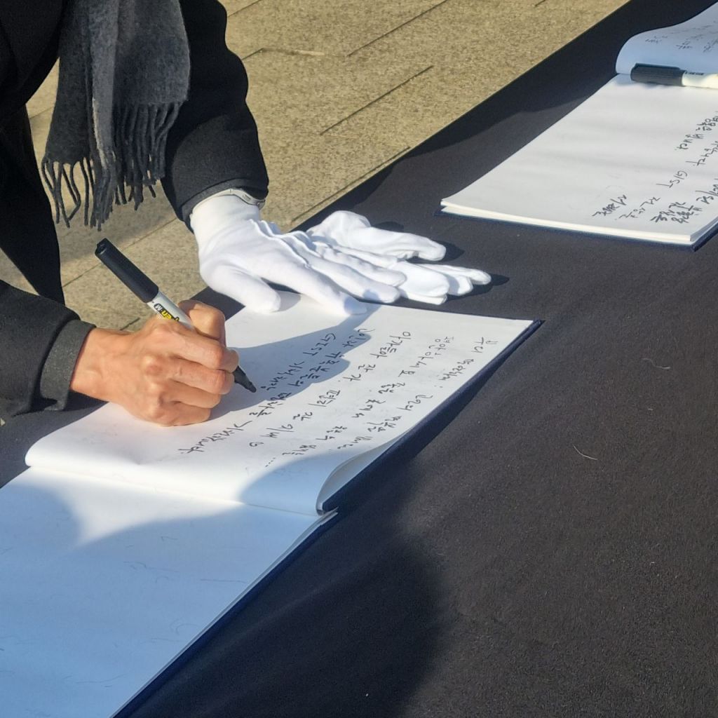 2일 광주시 동구 5·18민주광장에 제주항공 여객기 참사 희생자 합동분향소에서 조문을 마친 한 추모객들이 방명록을 작성하고 있다. 민찬기 기자
