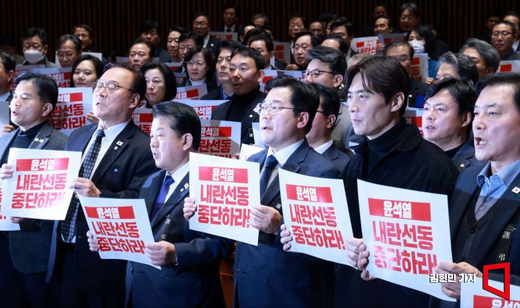박찬대 원내대표를 비롯한 더불어민주당 의원들이 2일 국회에서 열린 의원총회에서 윤석열 대통령에 대한 체포와 구속 수사를 촉구하며 구호를 외치고 있다.