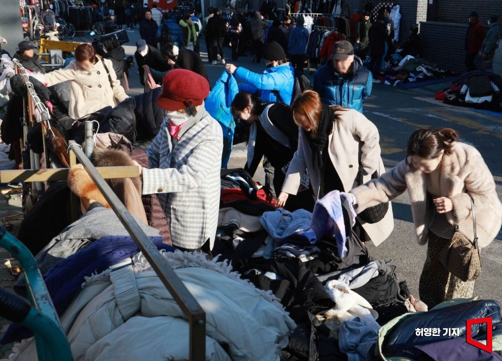 기온이 영상으로 올라가고 포근한 날씨를 보인 2일 오후 서울 동묘시장을 찾은 시민과 관광객들이 따뜻한 햇빛을 받으며 옷가지를 고르고 있다.