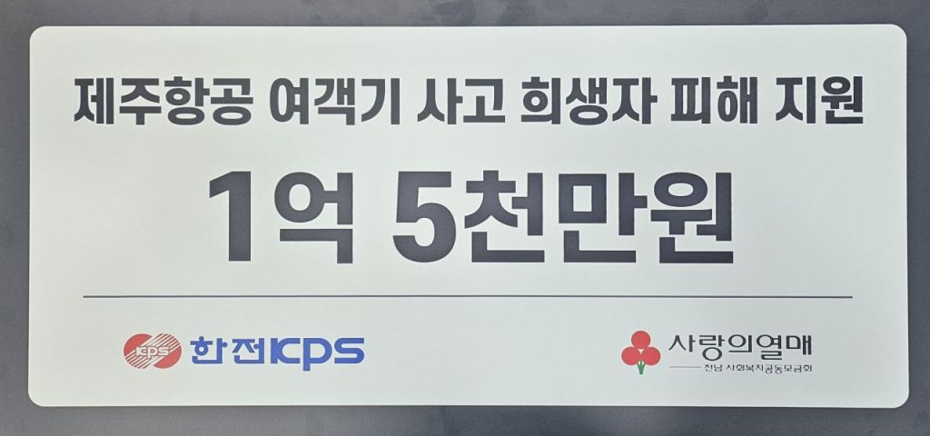 전남사회복지공동모금회(회장 노동일, 이하 전남 사랑의열매)는 한전KPS가 제주항공 여객기 사고 희생자 피해 지원을 위해 1억5,000만원의 성금을 전달했다고 2일 밝혔다.