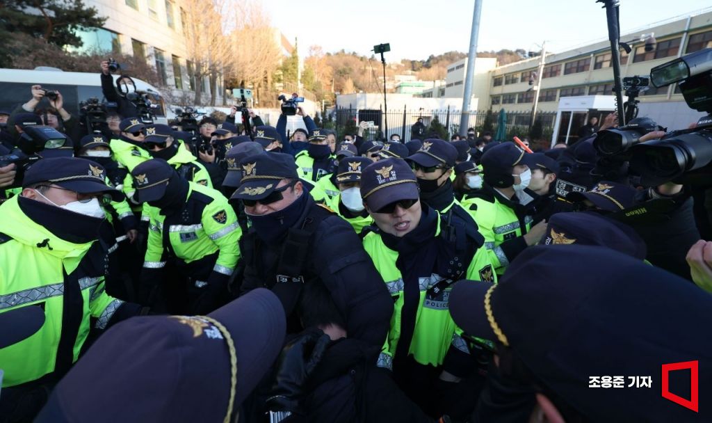 윤석열 대통령에 대한 체포영장 발부 사흘째인 2일 오후 서울 용산구 한남동 대통령 관저 정문 앞 도로에 누워있는 윤 대통령 지지자들을 경찰들이 해산시키고 있다.