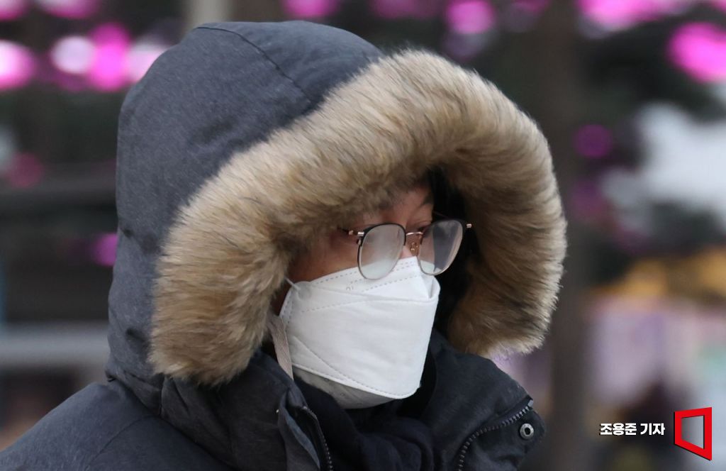 영하 10도를 밑도는 한파가 다시 몰아친 서울 종로구 광화문 네거리에 두툼한 복장은 한 직장인의 안경에 김이 서려있다.