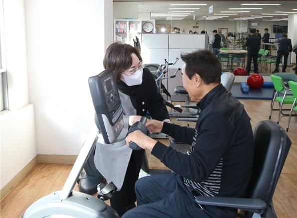 지난 2일 박희영 용산구청장(왼쪽)이 보건분소 물리치료실에서 운동 중인 주민과 인사를 나누고 있다. 용산구 제공.