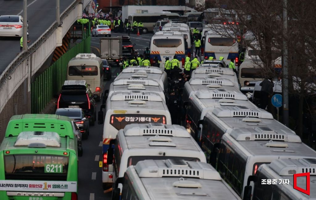 윤석열 대통령의 체포영장을 집행하기 위해 나선 고위공직자범죄수사처 수사관들을 태운 차량이 3일 서울 용산구 한남동 대통령 관저 입구에 도착한 가운데 경찰기동대 버스들이 이중으로 주차되어 있다.