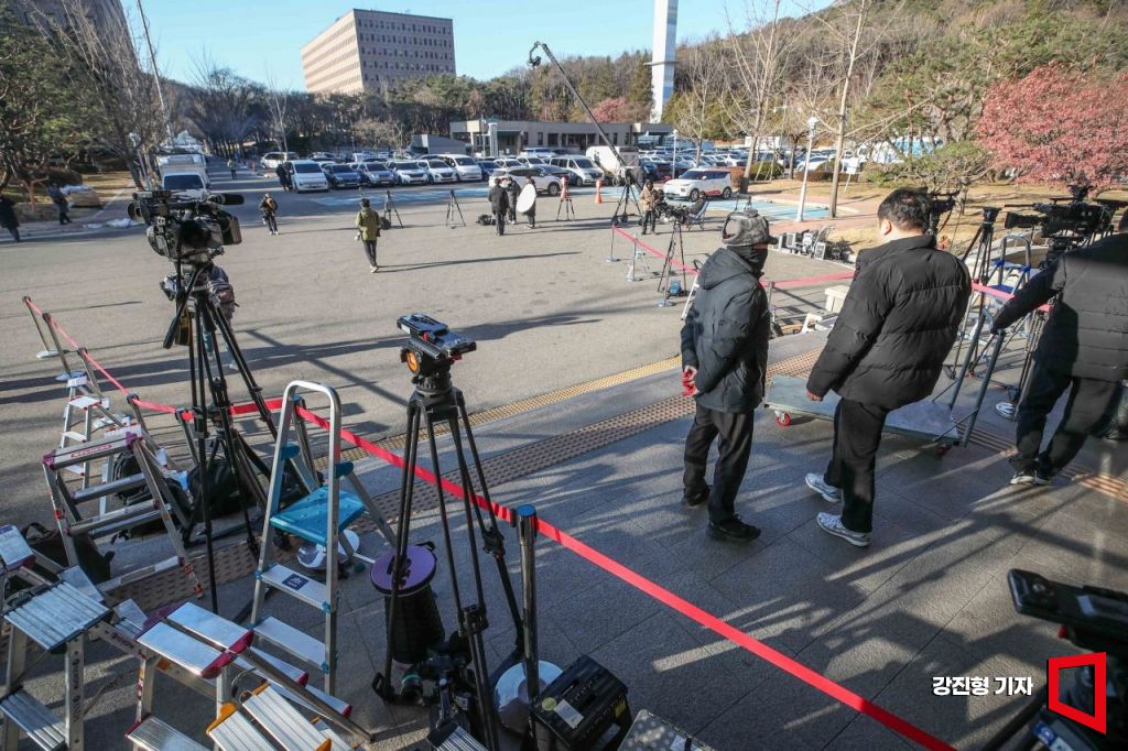 고위공직자범죄수사처가 윤석열 대통령 체포영장 집행에 나선 3일 공수처가 자리한 경기 정부과천청사 5동 앞에 포토라인이 설치돼 있다.