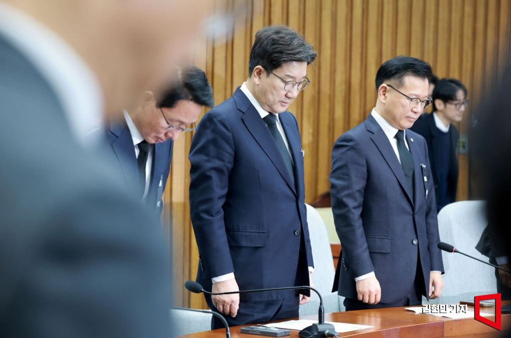 권성동 원내대표를 비롯한 국민의힘 원대지도부가 3일 국회에서 열린 원내대책회의에 앞서 무안 항공기 참사 희생자를 위한 묵념을 하고 있다.