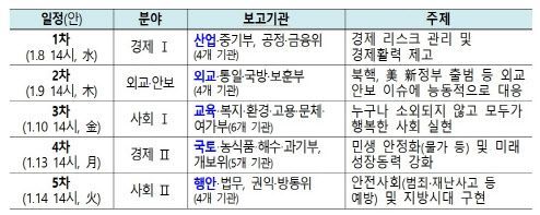 올해 정부 업무보고는 오는 8일부터 14일까지 대내외 리스크 관리, 취약계층 지원, 민생안정, 미래 성장동력 강화, 안전사회 구현 등 5개 분야별로 나누어 진행된다.