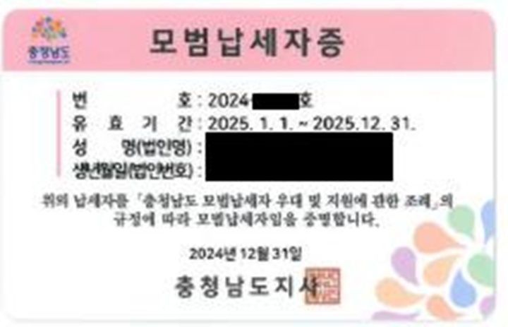 한편, 2024년 충청남도 모범납세자 중 당진시는 총 580명(개인 314명, 법인 266명)이 최종 선정됐으며, 우대 및 지정 기간은 올해 1월 1일부터 12월 31일까지 1년간이다.