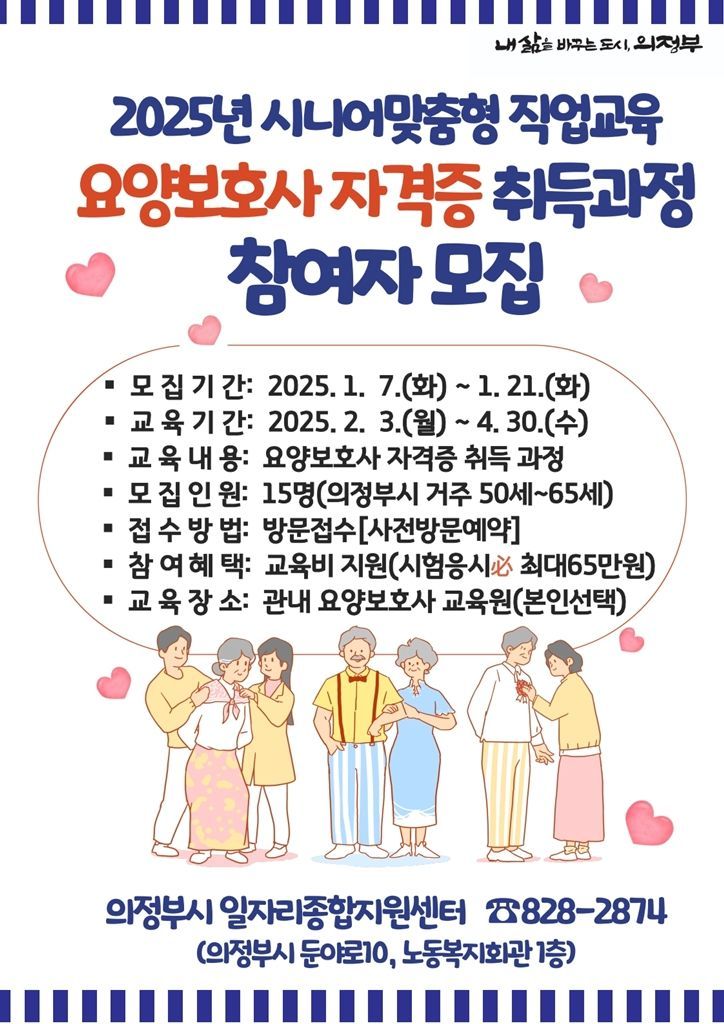 경기 의정부시(시장 김동근)는 구직자를 위한 맞춤형 직업교육 프로그램인 ‘요양보호사 자격증 취득 과정’ 참여자를 모집한다고 6일 밝혔다.