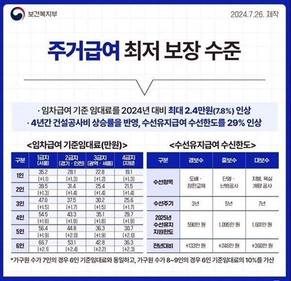 2025년 기준 중위소득이 인상됨에 따라 주거급여 수급자 선정 기준은 △1인 가구 소득인정액 114만8166원 △2인 가구는 188만7676원 △3인 가구는 241만2169원 △4인 가구는 292만6931원으로 확대된다.