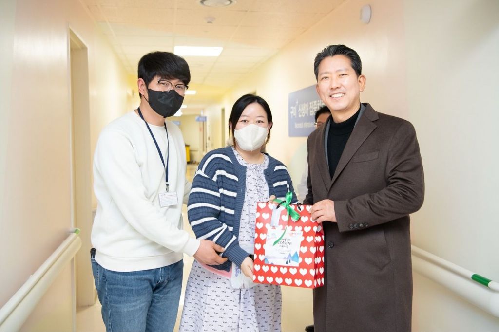 김장호 구미시장(오른쪽)이 신생아집중치료센터를 방문해 담당자들과 기념촬영 하고 있다. [사진=구미시]