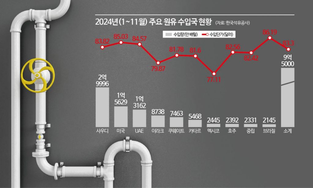 그 뒤를 이어 아랍에미리트(1억3162만배럴)와 이라크(8738만배럴), 쿠웨이트(7463만배럴), 카타르(5468만배럴)가 이름을 올렸다. 주요 수입 10개국 가운데 비중동 국가로는 미국과 멕시코(2445만배럴), 호주(2392만배럴), 브라질(2145만배럴)이 포함됐다.