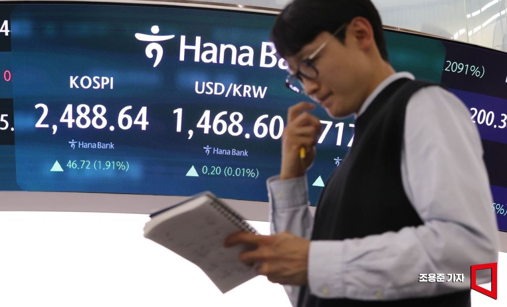 6일 서울 중구 하나은행 딜링룸 현황판에 코스피 지수 등이 표시되고 있다. 조용준 기자
