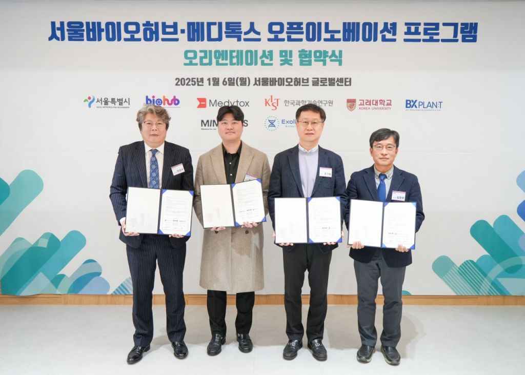 지난 6일 오전 서울바이오허브 글로벌센터 세미나실에서 서울바이오허브와 메디톡스-선발기업 간의 3자 업무협약을 체결한 후 관계자들이 기념 촬영을 하고있다.(왼쪽부터 주희석 메디톡스 부사장, 박형기 미메틱스 대표, 권기환 엑솔런스 대표, 김현우 서울바이오허브 센터장). 서울시 제공