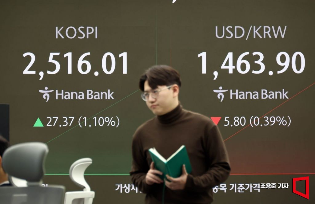 코스피가 사흘째 상승하며 2500선을 회복하며 출발한 7일 서울 중구 하나은행 딜링룸 직원들이 분주하게 움직이고 있다. 이날 코스피 지수는 전장보다 31.77포인트(1.28%) 오른 2,520.41에 코스닥은 전장보다 3.57포인트(0.5%) 오른 721.53에 장을 시작했다.