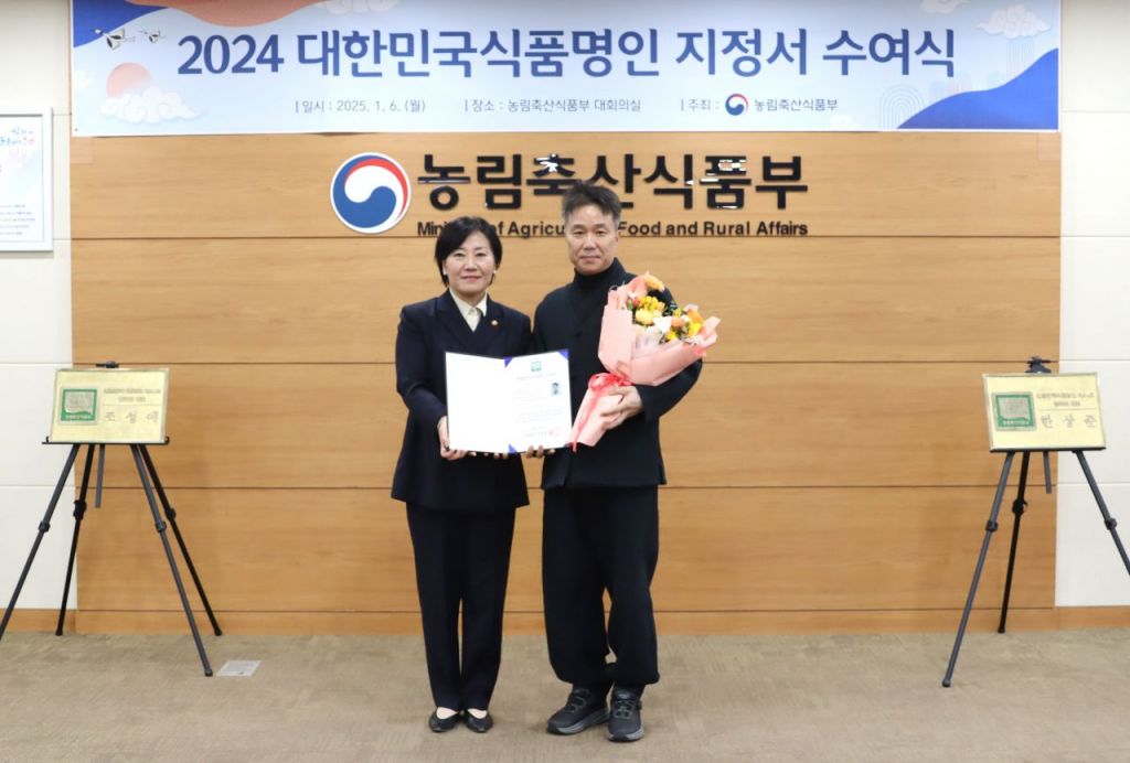한상준 초산정 대표(오른쪽)가 명인으로 지정된 뒤 지정서와 축하꽃다발을 들고 송미령 농림축산식품부 장관과 기념촬영을 하고 있다.
