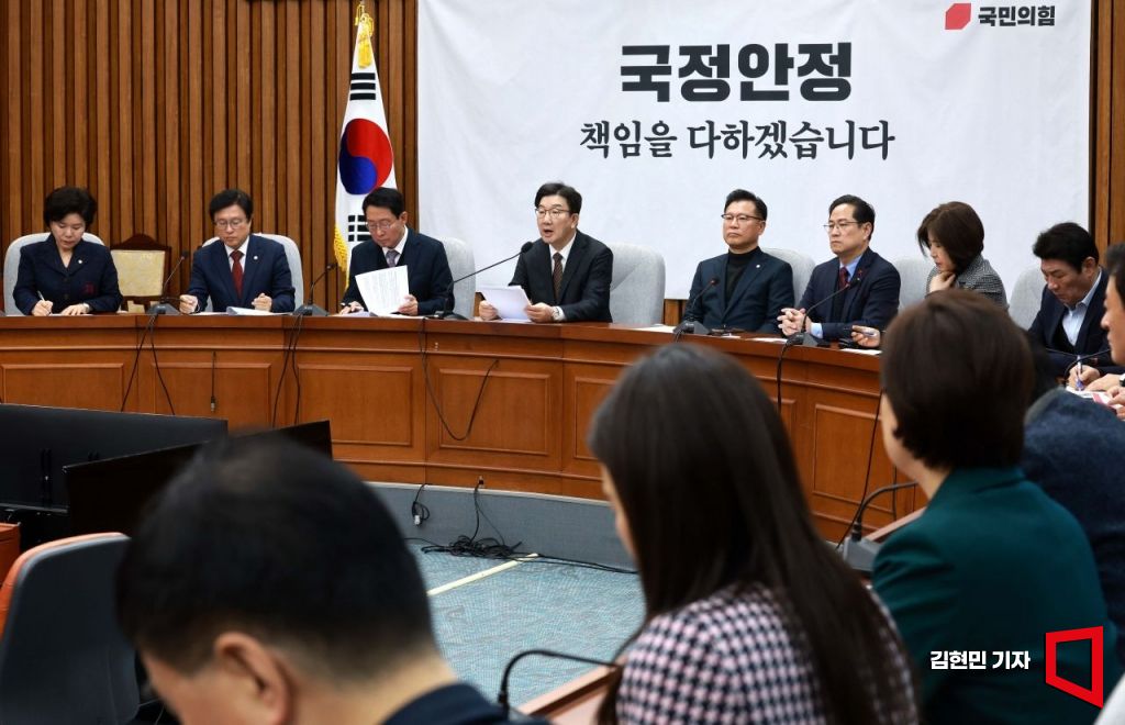 권성동 국민의힘 원내대표가 7일 국회에서 열린 원내대책회의에서 발언하고 있다.