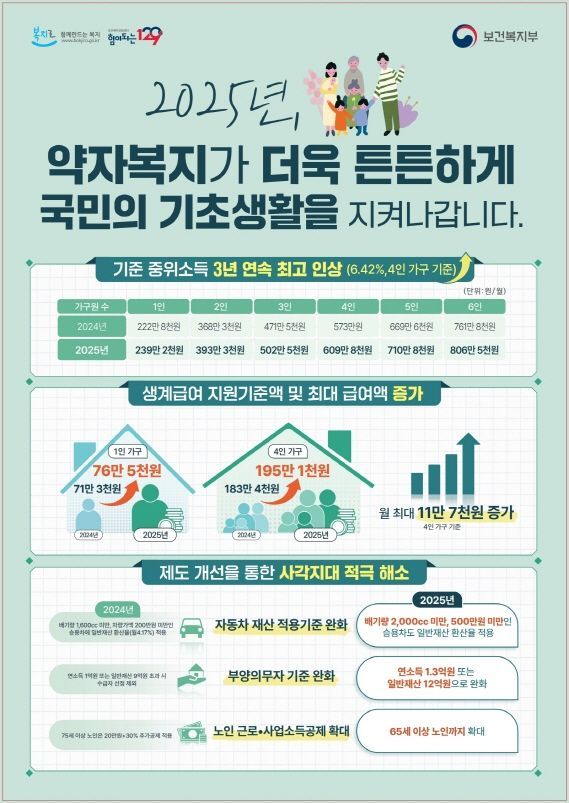 2025년 기준중위소득이 역대 최대 증가율로 확대되며 4인 가구 기준으로 지난해 572만9913원 대비 6.42% 인상된 609만7773원, 생계·의료·주거·교육급여를 포함한 전체 수급 가구의 약 74%를 차지하는 1인 가구 기준은 지난해 222만8445원 대비 7.34% 인상된 239만2013원으로 늘어났다.