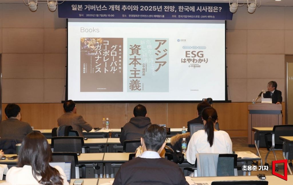 류시로 코다이라 일본 닛케이신문 선임기자가 7일 서울 여의도 FKI타워에서 열린 '일본 거버넌스 개혁 추이와 2025년 전망, 한국에 시사점은?' 포럼에서 기조연설을 하고 있다.