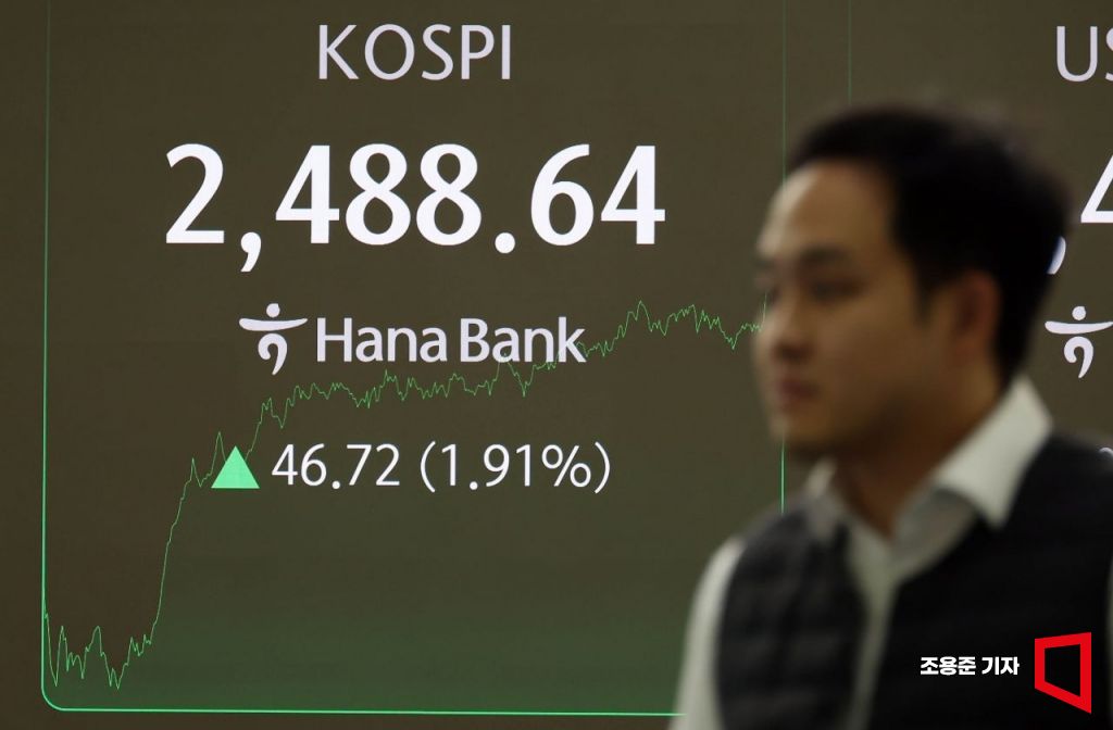 서울 중구 하나은행 딜링룸 현황판에 코스피 지수 등이 표시되고 있다. 조용준 기자