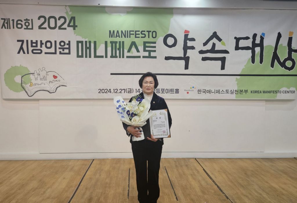최미숙 전남도의원은 ‘2024 지방의원 매니페스토 약속대상’ 에서 좋은조례 분야 우수상을 받았다. 전남도의회 제공
