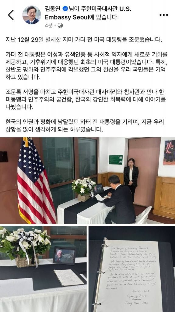 이어 "한국의 인권과 평화에 남달랐던 카터 전 대통령을 기리며, 지금 우리 상황을 많이 생각하게 되는 하루였다"고 덧붙였다.