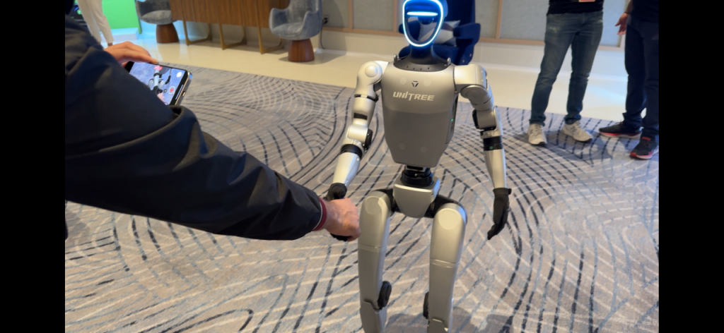 7일(현지시간) 엔비디아의 전시장에서 중국 유니트리의 인간형 로봇이 관객과 악수하고 있다. 사진=백종민 기자