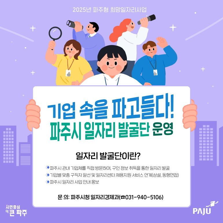 경기 파주시(시장 김경일)는 지역 내 민간 일자리 발굴 및 확대를 위해 ‘기업속을 파고들다! 일자리 발굴단’에 함께할 근로자를 8일부터 17일까지 모집한다.