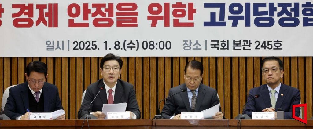 권성동 국민의힘 원내대표가 8일 국회에서 열린 비상 경제 안정을 위한 고위 당정협의회에서 발언하고 있다. 국회사진기자단