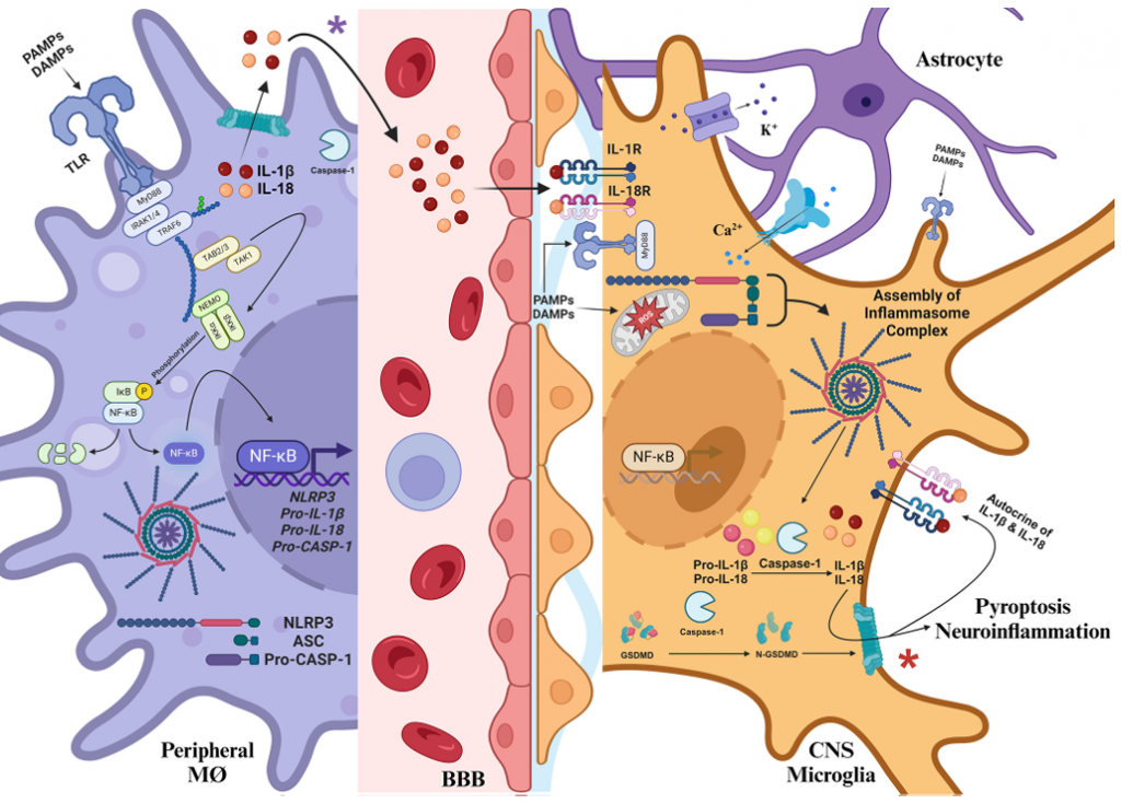중추신경계와 말초신경계에서 NLRP3 염증복합체 신호 경로가 염증 반응을 조절하며 상호작용하는 과정. 삼육대 제공