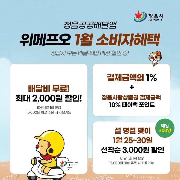 정읍 공공배달앱 위메프오 1월 소비자혜택 포스터. 정읍시 제공