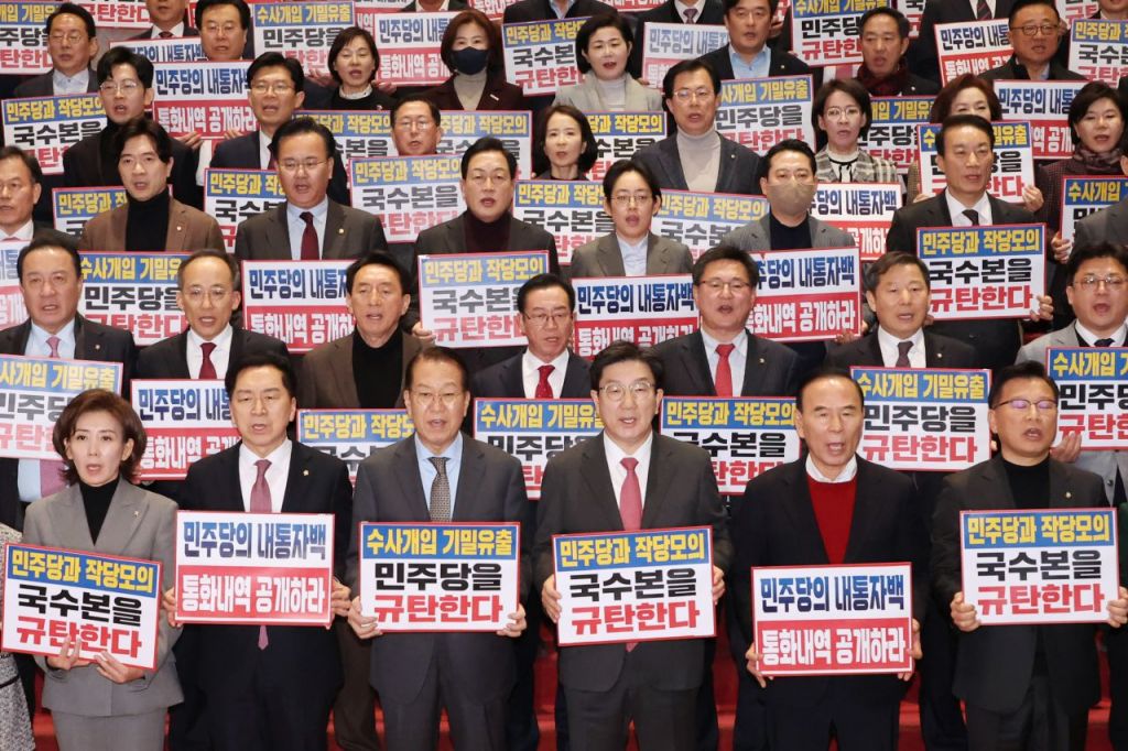 국민의힘은 이날 오후 국회 본회의에서 내란 특검법, 김건희 특검법을 비롯해 '농업 4법'(양곡관리법·농수산물가격안정법·농어업재해대책법·농어업재해보험법 개정안)과 국회법·국회 증감법 재표결 등 쟁점 법안이 모두 부결된 이후 민주당·국가수사본부의 수사내통 규탄대회를 열고 이같이 주장했다. 이번 규탄대회는 민주당이 쟁점 법안 부결 이후 진행한 내란 특검, 김건희 특검 등 재의 표결 부결 규탄대회 맞대응 성격이다.