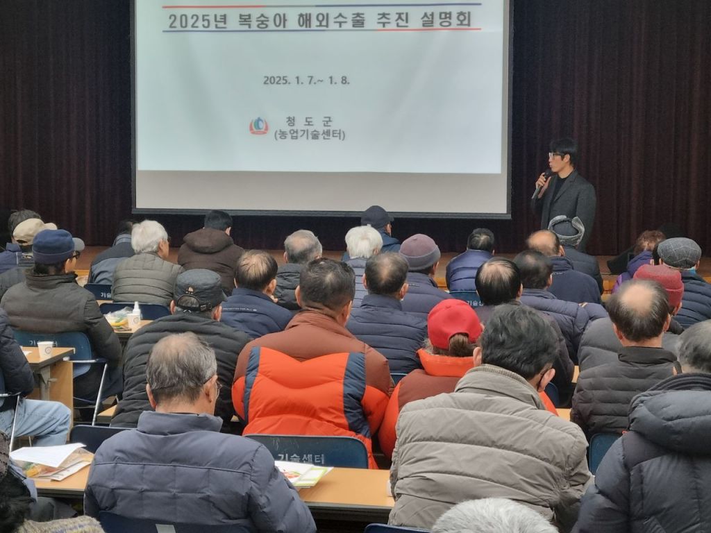 청도군은 7일, 8일 양 일간 농업기술센터 대회의실에서 ‘한국복숭아수출연합회’와 공동으로 청도 관내 복숭아 생산농가 및 관계자가 참석한 가운데 2025년 복숭아 해외수출 추진을 위한 설명회를 가졌다고 밝혔다.