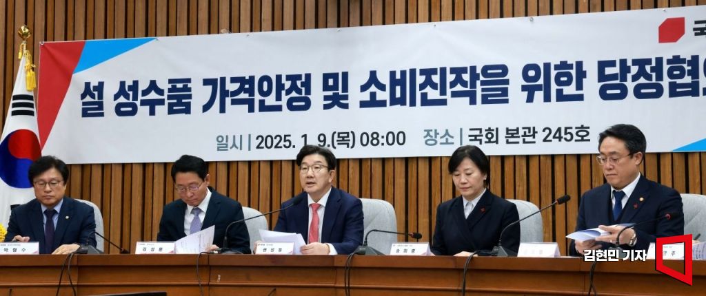 권성동 국민의힘 원내대표가 9일 국회에서 열린 설 성수품 가격안정 및 소비진작을 위한 당정협의회에서 발언하고 있다.