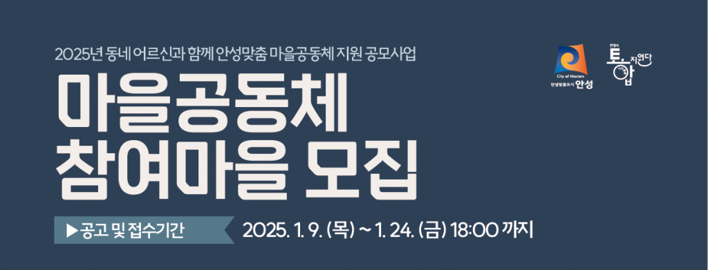 경기도 안성시 시민활동통합지원단 마을공동체지원센터는 오는 24일까지 '동네 어르신과 함께하는, 안성맞춤 마을공동체 지원 사업' 참여 마을을 공모한다.