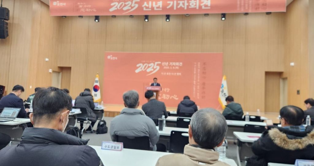 백영현 포천시장이 9일 열린 신년 기자회견에서 2025년 시정 운영 계획에 대해 설명하고 있다. 이종구 기자