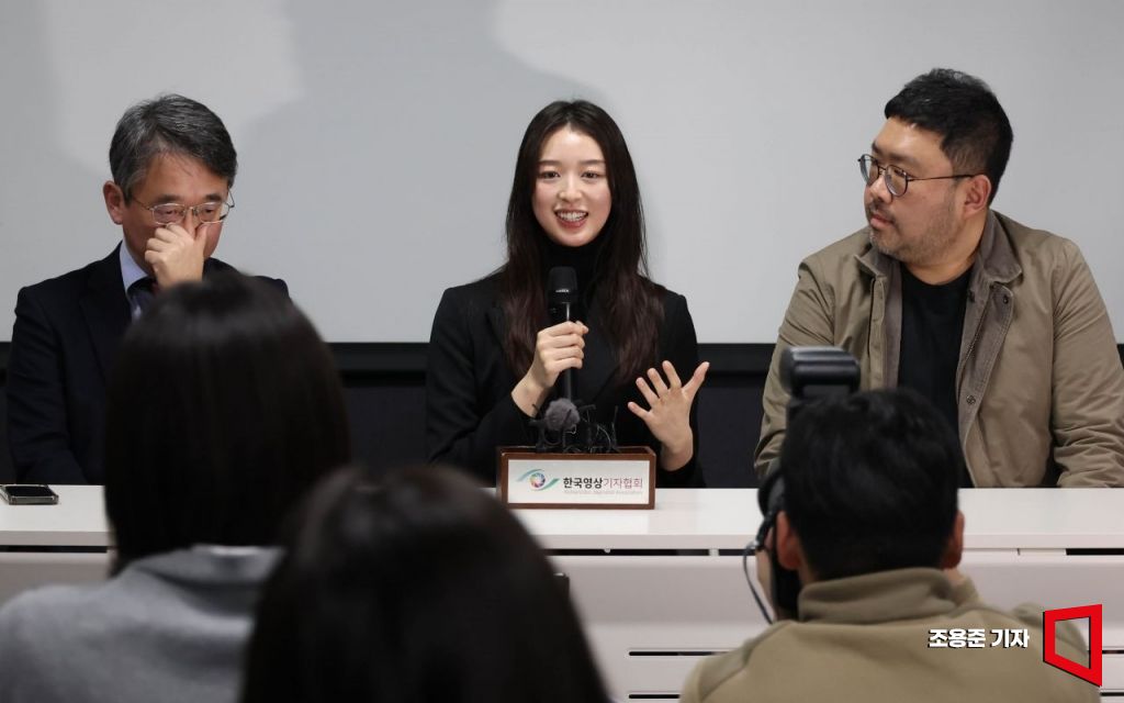 9일 서울 서초구 한국컨퍼런스센터에서 열린 '정명석(통칭 JMS) 대법원 선고 관련 기자간담회'에 피해자 메이플 씨가 취재진의 질문에 답하고 있다. 왼쪽부터 김도형 단국대 교수, 메이플 씨, 조성현 '나는 신이다' 프로듀서. 이날 대법원은 준강간, 준유사강간 등으로 기소된 정 씨의 상고심에서 징역 17년을 선고한 원심을 확정했다.