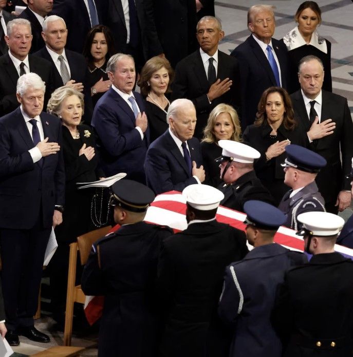 이 밖에 카멀라 해리스 부통령과 마이크 펜스 전 부통령 내외, J.D. 밴스 부통령 당선인, 쥐스탱 트뤼도 캐나다 총리, 안토니우 구테흐스 유엔(UN) 사무총장, 미국 상·하원 의원 등도 장례식에 참석했다.