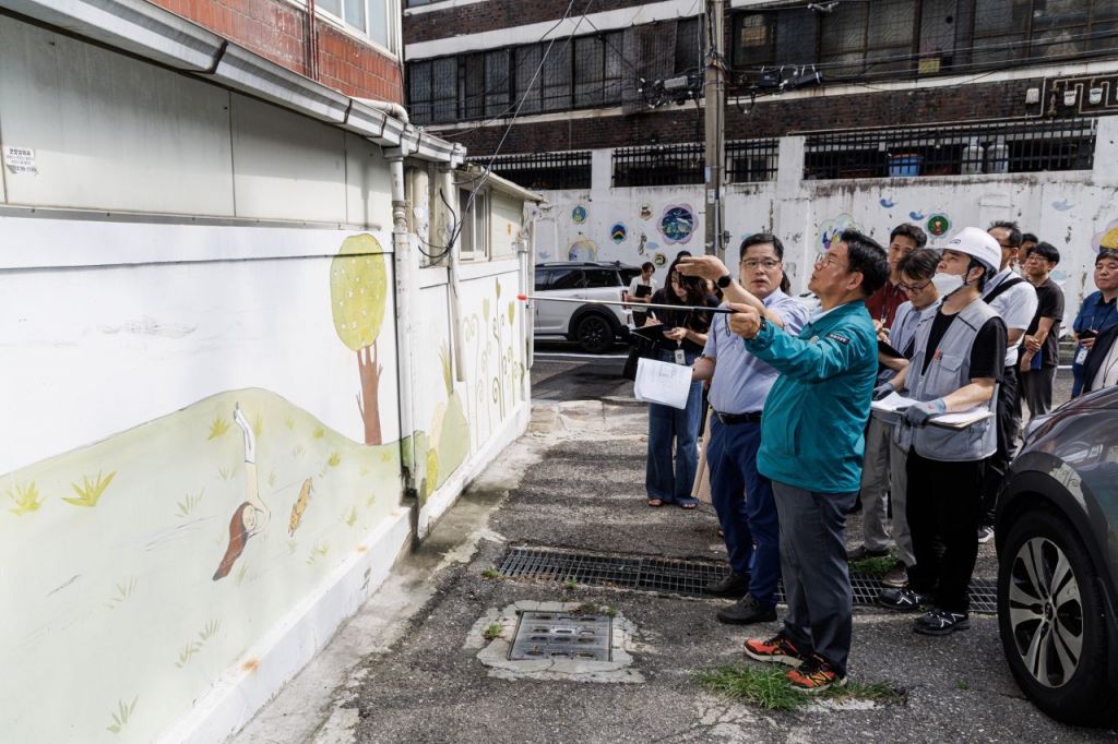 박강수 마포구청장이 취약계층 가정 벽을 살펴보고 있다.