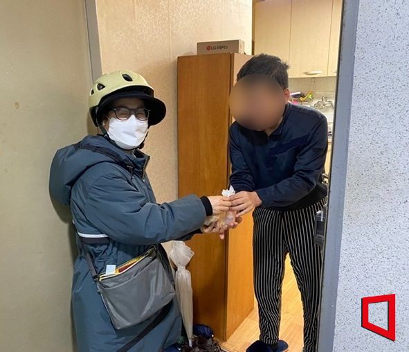 건강음료 배달매니저가 1인 가구를 방문해 음료를 전달하며 안부를 확인하고 있다. 인천 연수구 제공