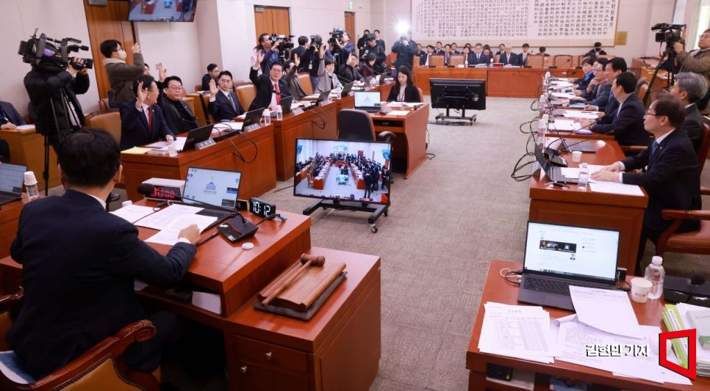 10일 국회에서 열린 법제사법위원회 전체회의에서 여당 의원들이 '윤석열 정부의 내란ㆍ외환 행위의 진상규명을 위한 특별검사 임명 등에 관한 법률안'을 상정을 반대하고 있다.