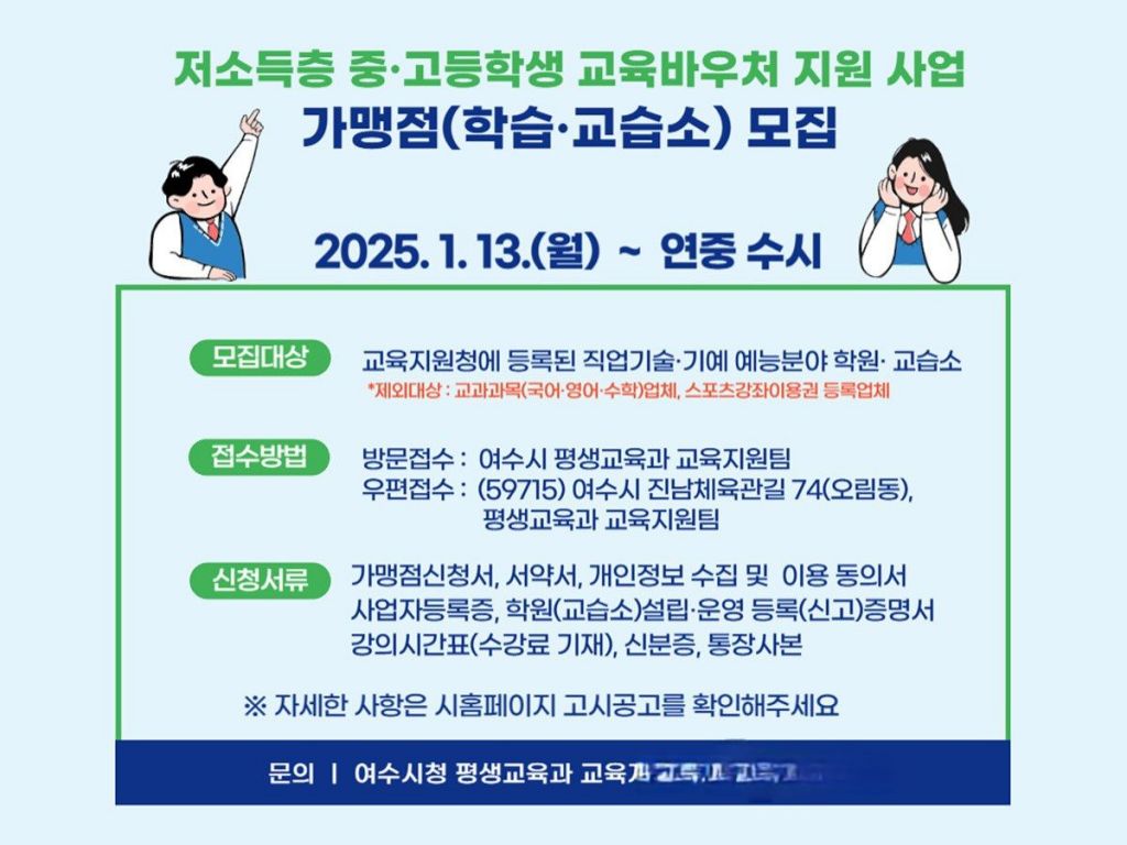 전남 여수시(시장 정기명)는 2025년 저소득층 중·고등학생 교육바우처 지원 사업에 참여할 가맹점을 이달 13일부터 연중 수시 모집한다고 밝혔다.