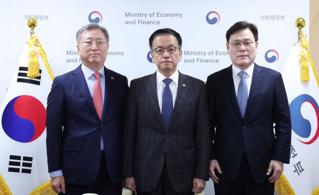 최상목 대통령 권한대행 부총리 겸 기획재정부 장관이 10일 서울 종로구 정부서울청사에서 최중경 국제투자협력 대사(왼쪽)와 최종구 국제금융협력 대사(오른쪽)를 접견하고 기념사진을 찍고 있다. (출처:기획재정부)