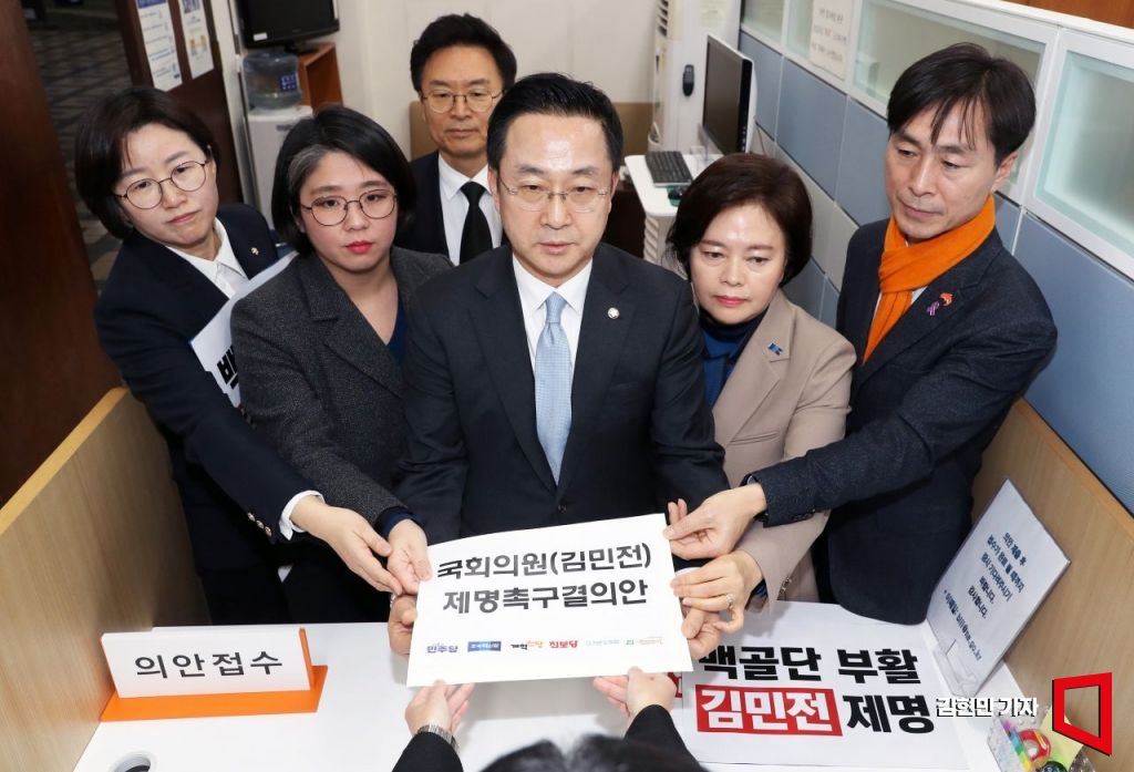 야6당 대표 의원들이 10일 국회 의안과에 김민전 국민의힘 의원 제명촉구 결의안을 제출하고 있다. 김 의원은 지난 9일 '백골단' 기자회견을 주선해 물의를 일으켰다. 김현민 기자