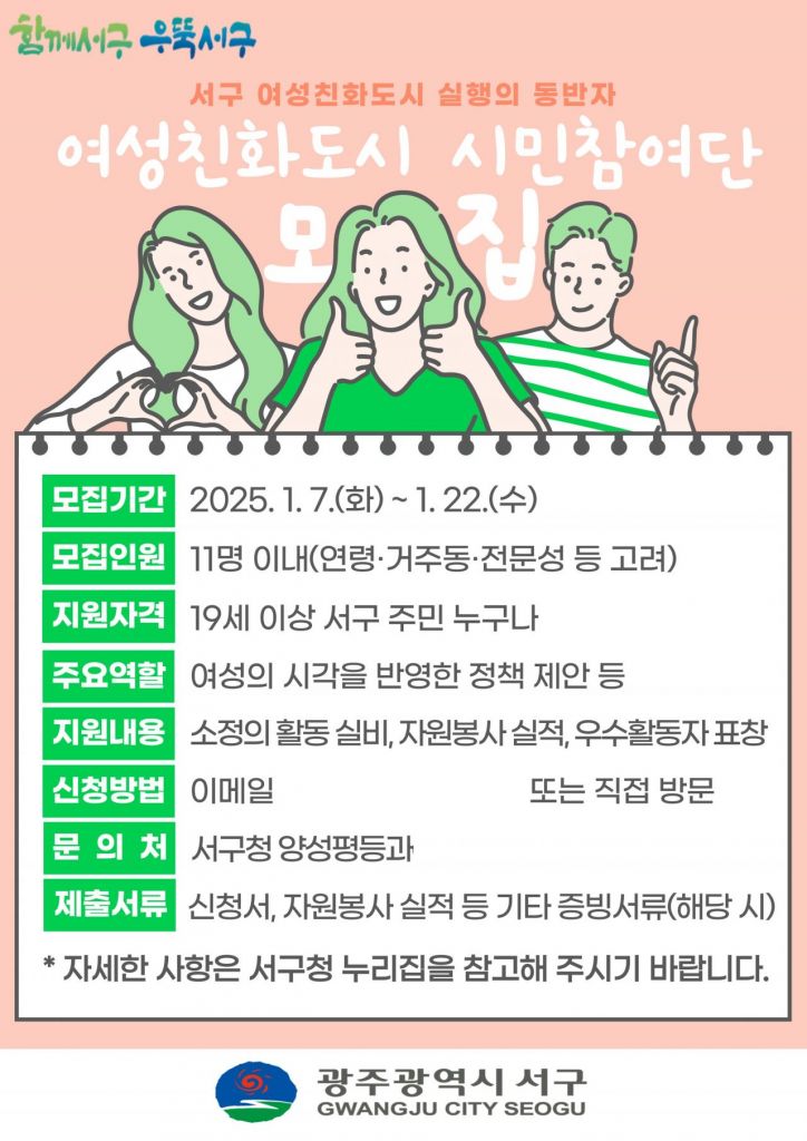 광주 서구가 오는 22일까지 여성친화도시 실행의 동반자로서 활동할 시민참여단을 모집한다.