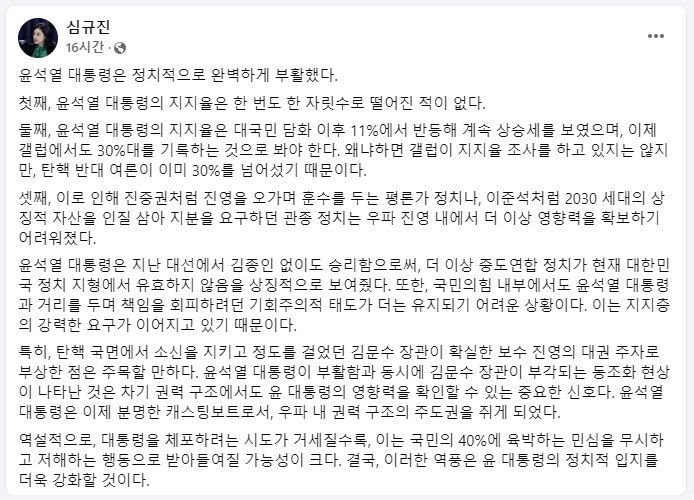 그러면서 "지지층의 강력한 요구가 이어지고 있기 때문에 국민의힘 내부에서도 윤 대통령과 거리를 두며 책임을 회피하려던 기회주의적 태도가 더는 유지되기 어려운 상황"이라고 했다.