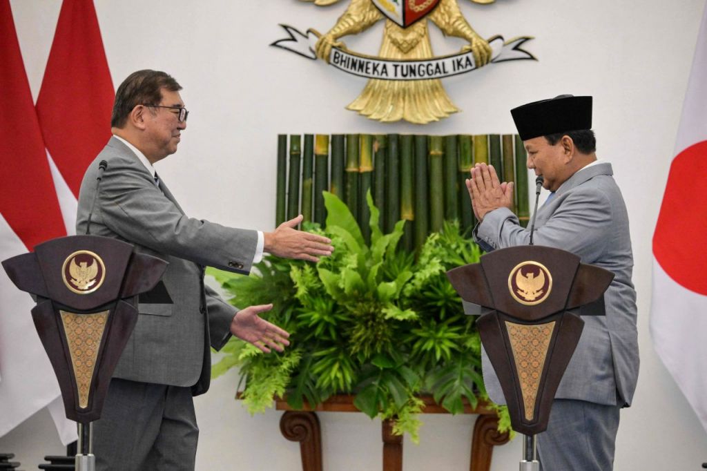 인도네시아 서자바주 보고르에 있는 인도네시아 대통령궁에서 이시바 시게루 일본 총리(왼쪽)와 프라보워 수비안토 인도네시아 대통령이 공동 기자회견에 앞서 악수하고 있다. AFP 연합뉴스