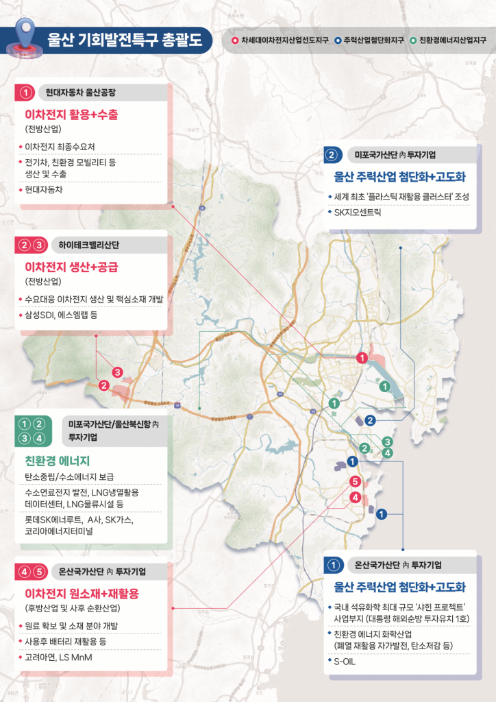 울산시는 지난해 11월 산업통상자원부로부터 기회발전특구로 지정받았다. 특히 기회발전특구에는 11개 선도기업이 22조원의 대규모 투자를 계획하고 있다. 올해는 기회발전특구에 투자하는 기업들에 세제·재정 지원 등의 인센티브 제공으로 기업의 후속 투자를 본격적으로 끌어낼 계획이다.