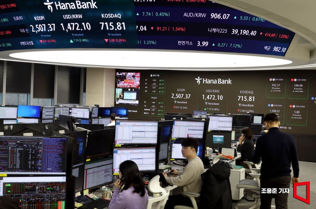미 증시 및 금리인하 기대감이 줄면서 나스닥이 1.63% 하락 마감한 13일 코스피 지수는 전장보다 7.63포인트(0.30%) 내린 2508.15에, 원달러 환율은 8.2원 상승한 1,473.2원에 장을 시작했다. 이날 서울 중구 하나은행 딜링룸 직원들이 업무를 보고 있다.